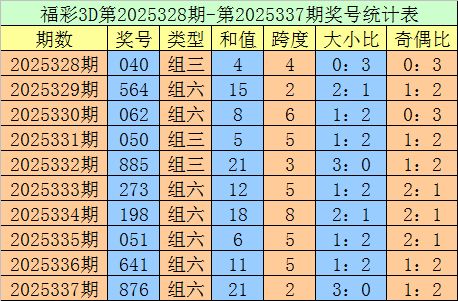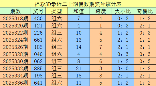 上期回顾:福利彩票3D第2025337期开出奖号876。奖号类型:组六,大小形态:大大大,奇偶形态:偶奇偶。