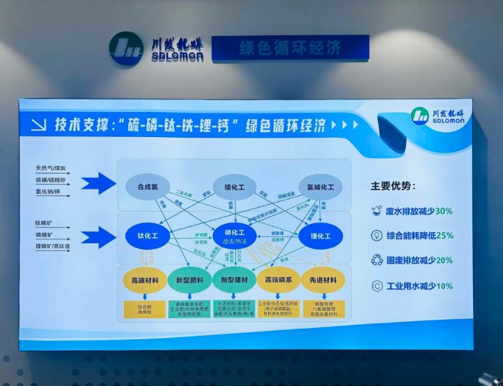 “硫-磷-钛-铁-锂-钙多资源循环利用,钛化工废硫酸供磷化工使用,硫化工副产蒸汽满足磷化工、钛化工热源需求,副产石膏、硫酸亚铁实现资源化,硫酸亚铁应用于磷酸铁、磷酸铁锂。”据川发龙蟒公司相关负责人介绍,通过循环经济模式的全面推行,废水排放减少30%以上,综合能耗降低25%以上,固废排放减少20%,工业用水消耗持续下降,中水回用率高达85%。