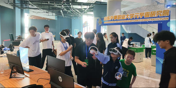 近日,由威海市教育局、威海市科协共同主办的“威海市第十一届中小学生科技节”上,山东外事职业大学元宇宙研究院携多款自主研发产品精彩亮相。本次科技节以“AI赋能 科技改变世界”为主题,活动现场,研究院展示了自主研发的两款VR游戏以及一款数字孪生产品,吸引众多目光。