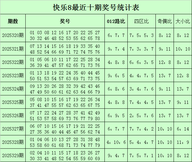 福彩快乐8第2025329期开奖回顾:02 04 10 11 15 17 18 23 26 27 30 33 41 48 52 54 55 59 60 69,其中奖号012路比为9:4:7,四区比为7:5:7:1,奇偶比为10:10,大小比为8:12。