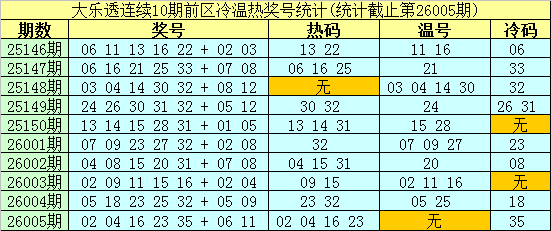 大乐透第25146期-第26005期前区奖号冷温热分布统计:
