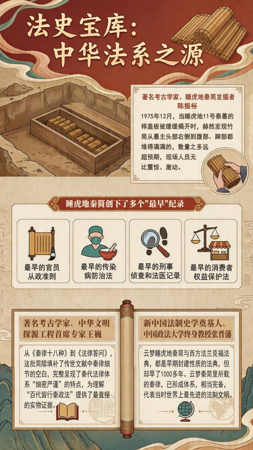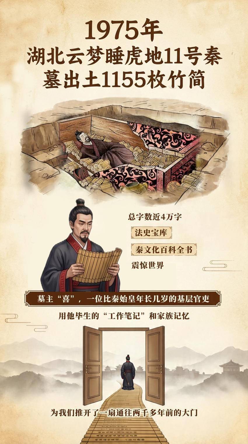 1975年,湖北云梦睡虎地11号秦墓出土的1155枚竹简,总字数近4万字,震惊了世界,被誉为“法史宝库”“秦文化百科全书”。