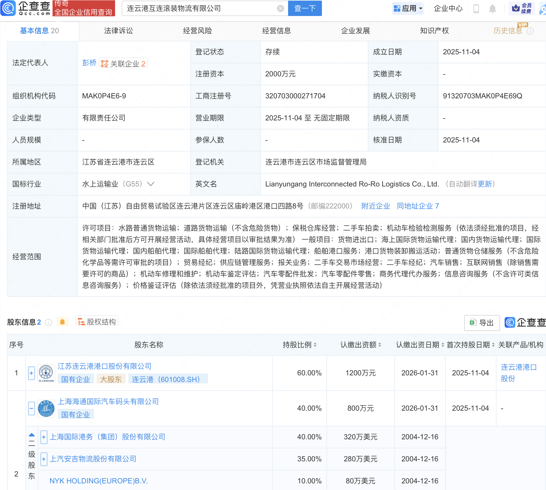 近日,连云港互连滚装物流有限公司成立,注册资本2000万元,经营范围包含:供应链管理服务;报关业务;二手车交易市场经营;二手车经纪;汽车销售等。企查查股权穿透显示,该公司由连云港(601008)、上港集团(600018)持股公司上海海通国际汽车码头有限公司共同持股。